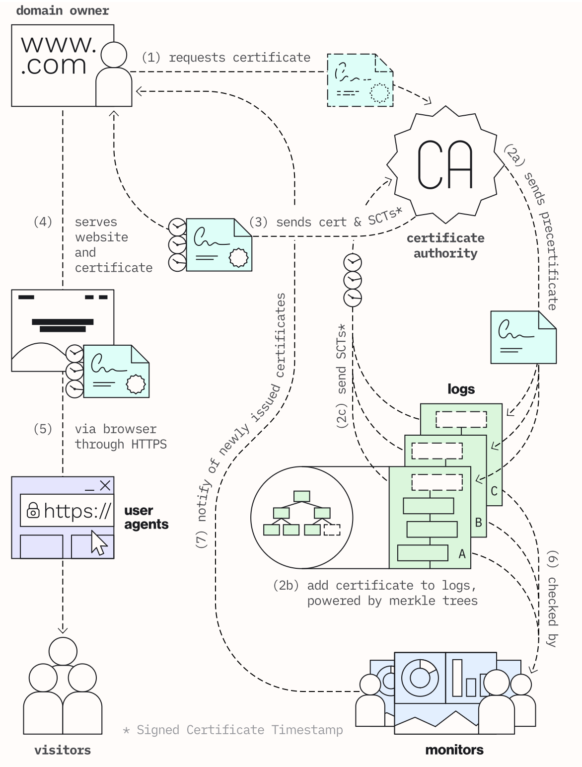 Принцип работы Certificate Transparency [2] в текущей реализации (схематично показан на рис. 1):