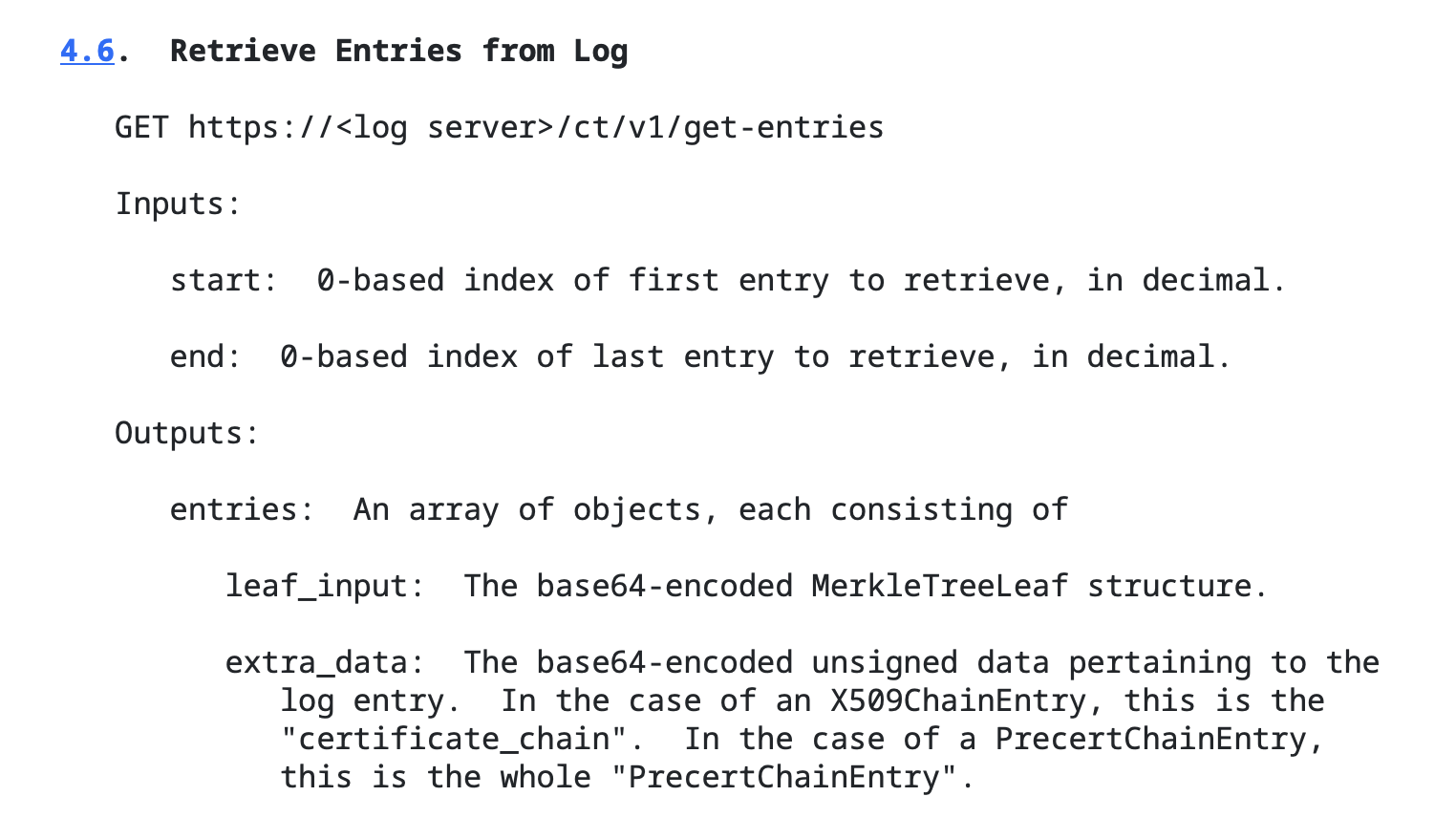 Исследованные логи используют версию 1.0 Certificate Transparency. Её спецификация опубликована в документе RFC 6962 [8]. Для получения пресертификатов из CT-логов необходимы секции спецификации 4.3 «Retrieve Latest Signed Tree Head» (используется способ получения размера лога сертификатов) и 4.6 «Retrieve Entries from Log» (используются непосредственно сертификаты и пресертификаты) (рис. 2 и 3).