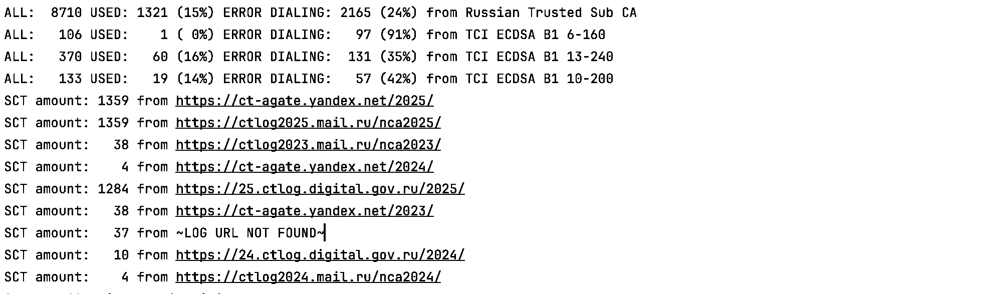 На рисунке 4 приведён скриншот результата работы программы без информации об ошибках, а далее — текст результата. Адрес лога «~LOG URL NOT FOUND~» означает, что найти лог, которому соответствует данная SCT-метка, не удалось. Возможно, это метки лога Certificate Transparency Минцифры России 2023 года, поскольку на момент исследования данный CT-лог был недоступен.