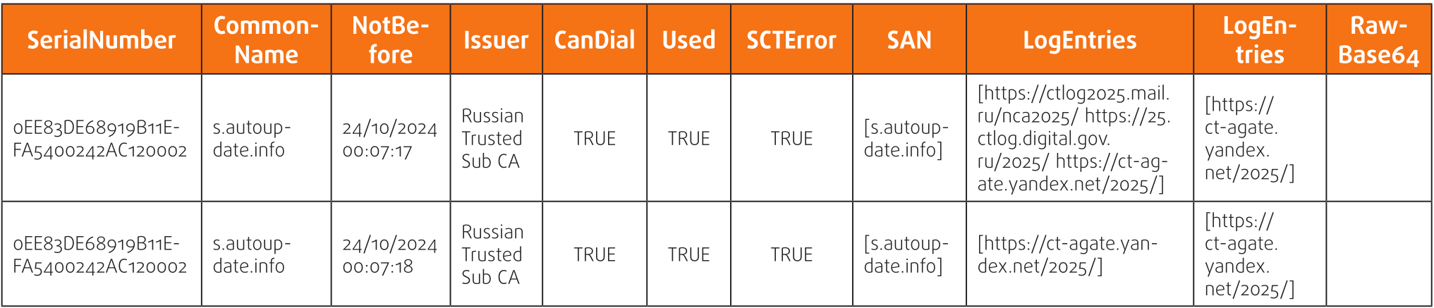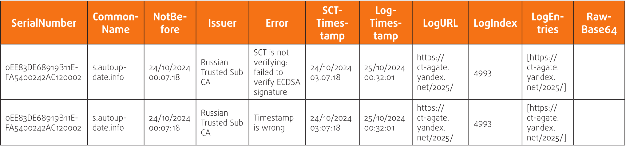 Таблица 2. Табличная запись о сертификате, SCT-метку которого не удалось верифицировать, и соответствующем ему пресертификате