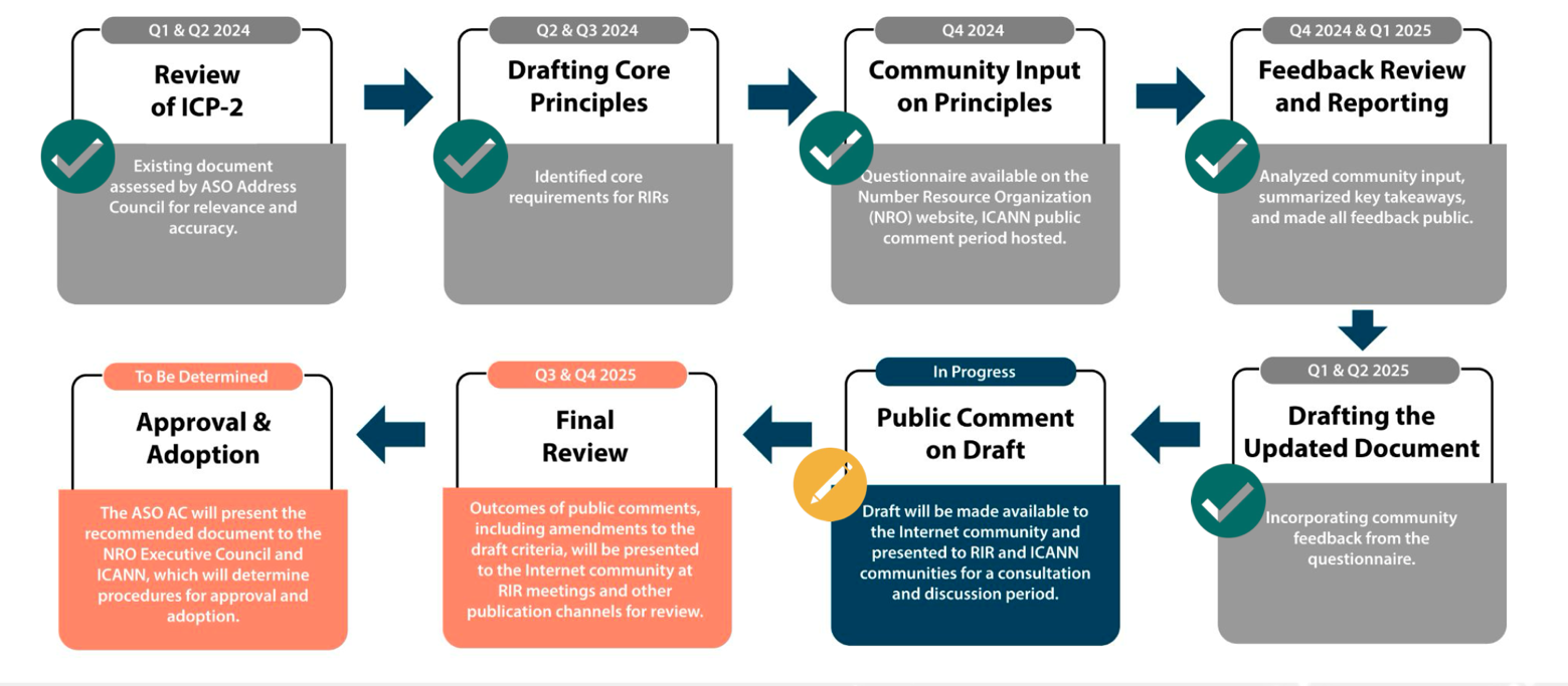 На данном этапе проводится обсуждение второй ревизии документа. Она существенно отличается от оригинального документа ICP-2, начиная с названия – «Governance Document for the Recognition, Operation, and Derecognition of Regional Internet Registries» (Руководящий документ по признанию, функционированию и лишению статуса региональных интернет-регистратур) – и заканчивая существенно расширенными рамками: новый документ охватывает весь жизненный цикл РИР (от признания до, при необходимости, лишения статуса и прекращения деятельности) и вводит более подробные требования к управлению, ответственности, прозрачности и процедурам.