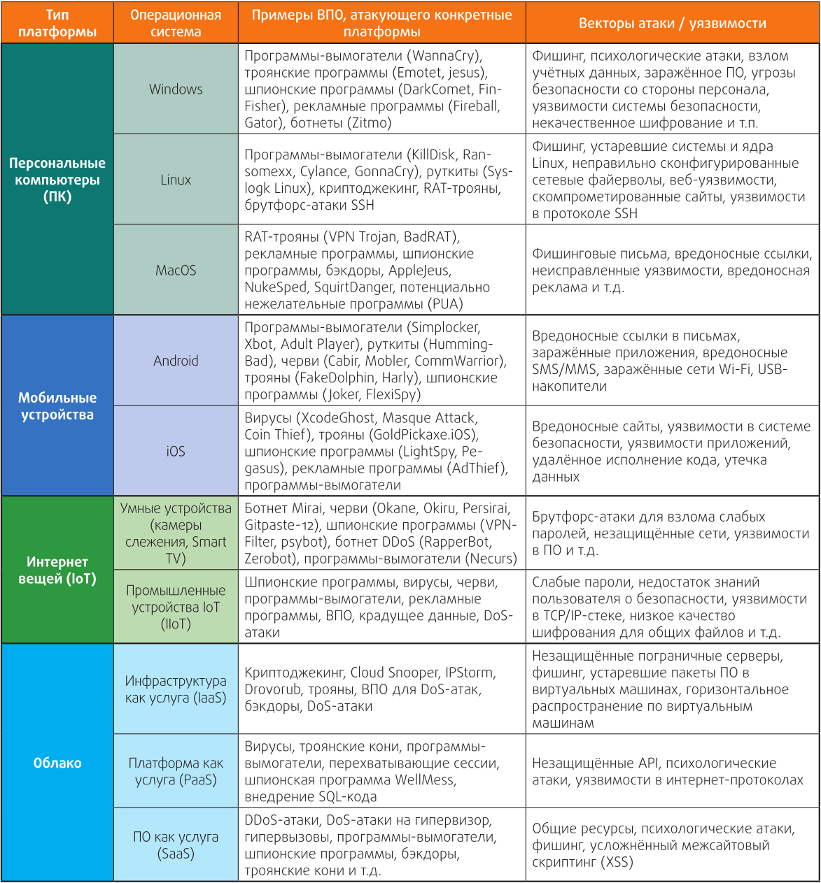 Компьютеры являются основной целью ВПО, при этом различные типы ВПО эксплуатируют конкретные уязвимости в средах Windows, macOS и Linux. В исследовании рассматриваются ВПО, атакующие каждую из указанных операционных систем, подчёркиваются общие для всех угрозы, типичные векторы атаки и способы устранения угроз.