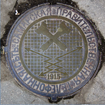 Самарская правительственная телефонная сеть — 1915, Самара. Второе изображение – реконструкция для более наглядного выделения скрещённых трубок и видоизменённых стрел с герба ГУПТ. Таких люков в Самаре до недавнего времени было несколько [5].