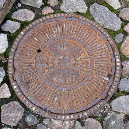 Точно такие же стрелы, но без короны есть на люках в Таллине с буквами РМЗ БВМС, которые означают не функциональную принадлежность люка, а его производителя — Ремонтно-механический завод Балтвоенморстроя. Это ориентировочно 1948 год или позже.